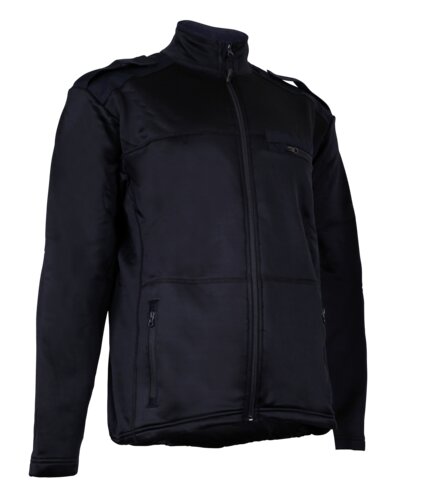 Fleecejakke med lynlås foran, forlænget ryg, justerbar søm, brystlomme med kant i venstre side, to frontlommer og skulderklapper til emblemer.