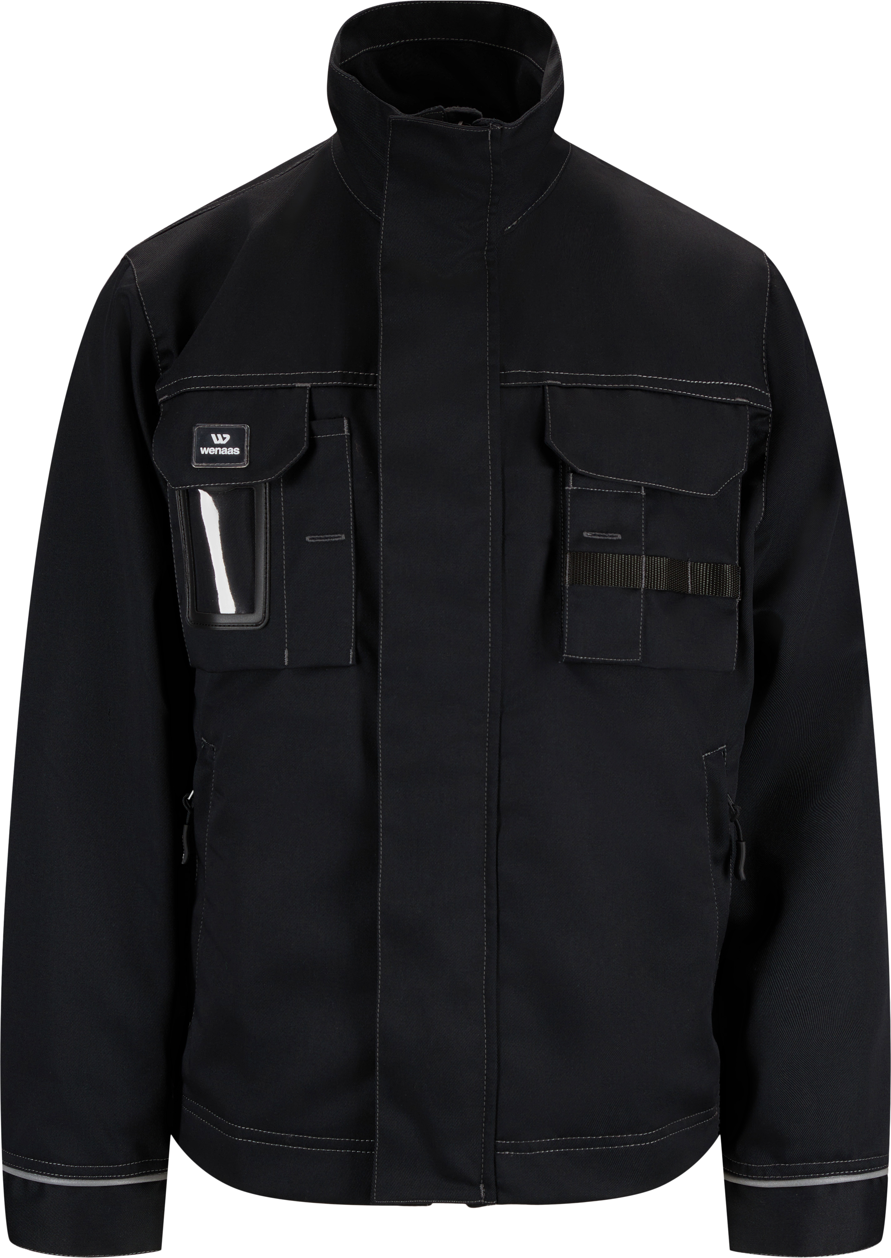 Reflektierende Paspelierung am Rücken und am unteren Ärmel. Weiches Microfleece am Innenkragen. Reißverschluss an der Vorderseite. Zwei Brusttaschen mit Patte und Klettverschluss. Rechte Seitentasche mit Ausweisfach und Stifttasche. Linke Seitentasche mit Pfennigtasche. Zwei Vordertaschen. Zwei Innentaschen, eine davon mit Handytasche, Druckknopf am Ärmelabschluss und Weitenregulierung am seitlichen Bund. Verlängertes Rückenteil,