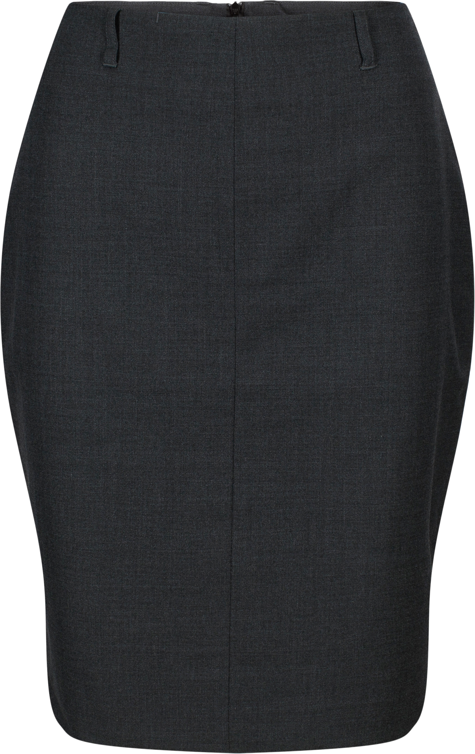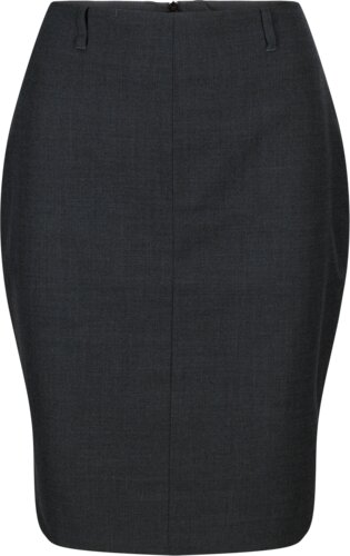 Eng anliegend, knielang, geschlossener Schlitz in der hinteren Mitte, Nähte in der vorderen Mitte, zwei Schlitze im hinteren Bund, sechs Gürtelschlaufen, verdeckte Tasche auf der rechten Seite des Bundes und mit Gummizug gefüttert.