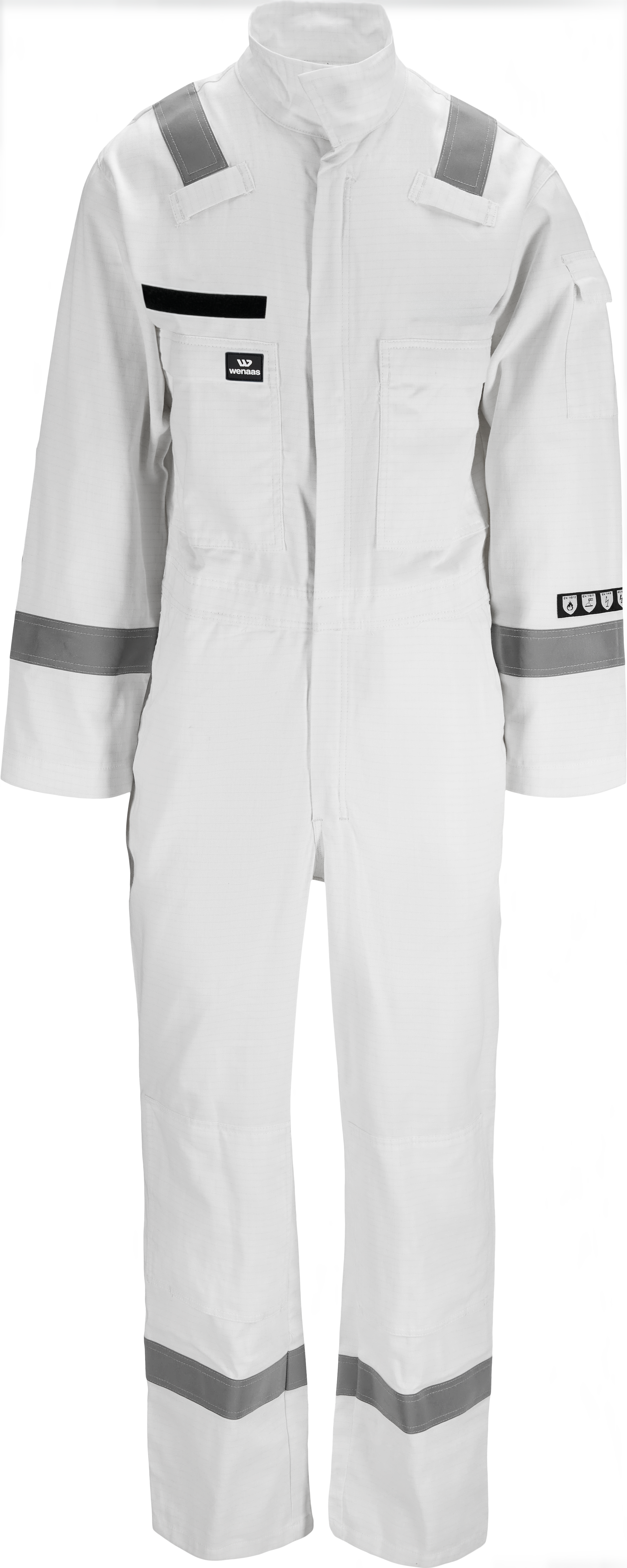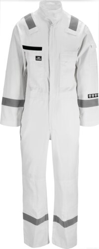 Leichter, flammhemmender Overall mit Stehkragen, Zwei-Wege-Reißverschluss unter der Frontpatte, Rückenfalte, elastischem Bund, weichem Klettverschluss für Namensschild auf der linken Brust, Brusttaschen mit Reißverschlüssen und Patten, Innentasche, Ärmeltasche mit Patte, Seitentaschen mit Durchgriffsöffnungen, Gesäßtaschen mit Patten, Werkzeugtasche, Kniepolstertaschen und Reflektorstreifen an Armen, Beinen und Schultern.