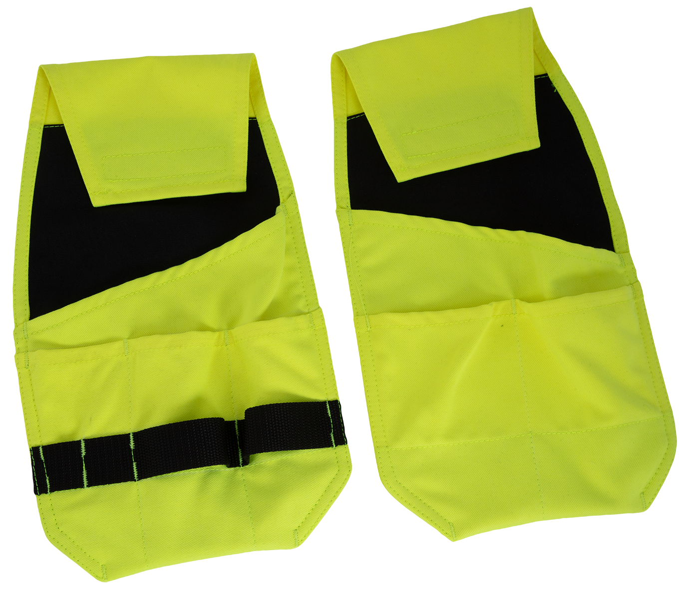 2. Doppelte Aufhängetaschen mit Verstärkung innen. Zwei Riemen können um den Gürtel gefaltet und am oberen Teil mit einem Klettverschluss geschlossen werden. Die rechte Tasche hat ein großes Fach, drei kleinere Fächer und ein horizontales Gurtband für Werkzeuge an der Vorderseite. Die linke Tasche hat ein großes Fach und zwei kleinere Fächer auf der Vorderseite.