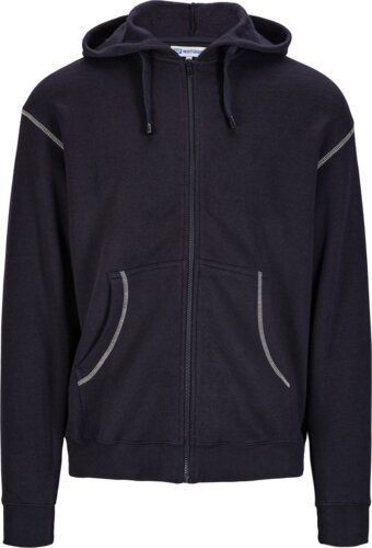 Klassischer Hoodie, Kontrastnähte, Reißverschluss vorn, zwei Taschen vorn, Kapuze mit Kordelzug, Rippenstrickbündchen an Ärmeln und Saum.