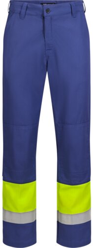 Bund mit Gürtelschlaufen, Knopfverschluss vorn und Hosenschlitz mit Reißverschluss. Vordertaschen, Gesäßtaschen, Zollstocktasche und höhenverstellbare Kniepolstertaschen. Verstellbare Beinsäume und Reflektorstreifen an den Beinen.