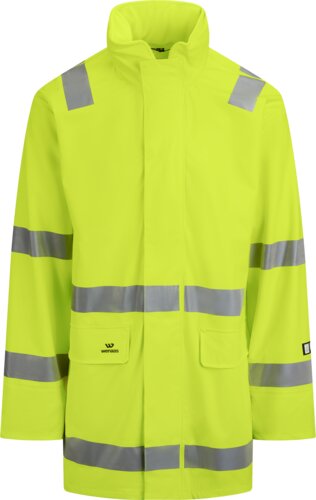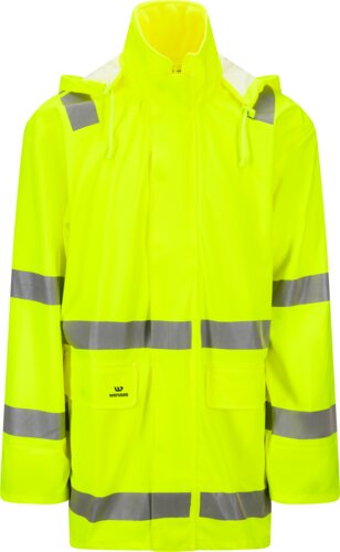 Warnschutzregenjacke mit Fleecekragen und verdeckter großer Kapuze mit helmtauglicher Krempe, Frontverstellung, verdecktem Reißverschluss unter der Frontpatte, mit Kunststoffkappen verschlossener Patte, 2 Fronttaschen mit Patten und Ösen zur Entwässerung, verschweißten Nähten, Schweißverstärkung in der querlaufenden Naht und auf der Oberseite der Patten, verdeckten Bündchen in den Ärmeln, 2 Reflektorstreifen um Ärmel, Rumpf und über den Schultern.