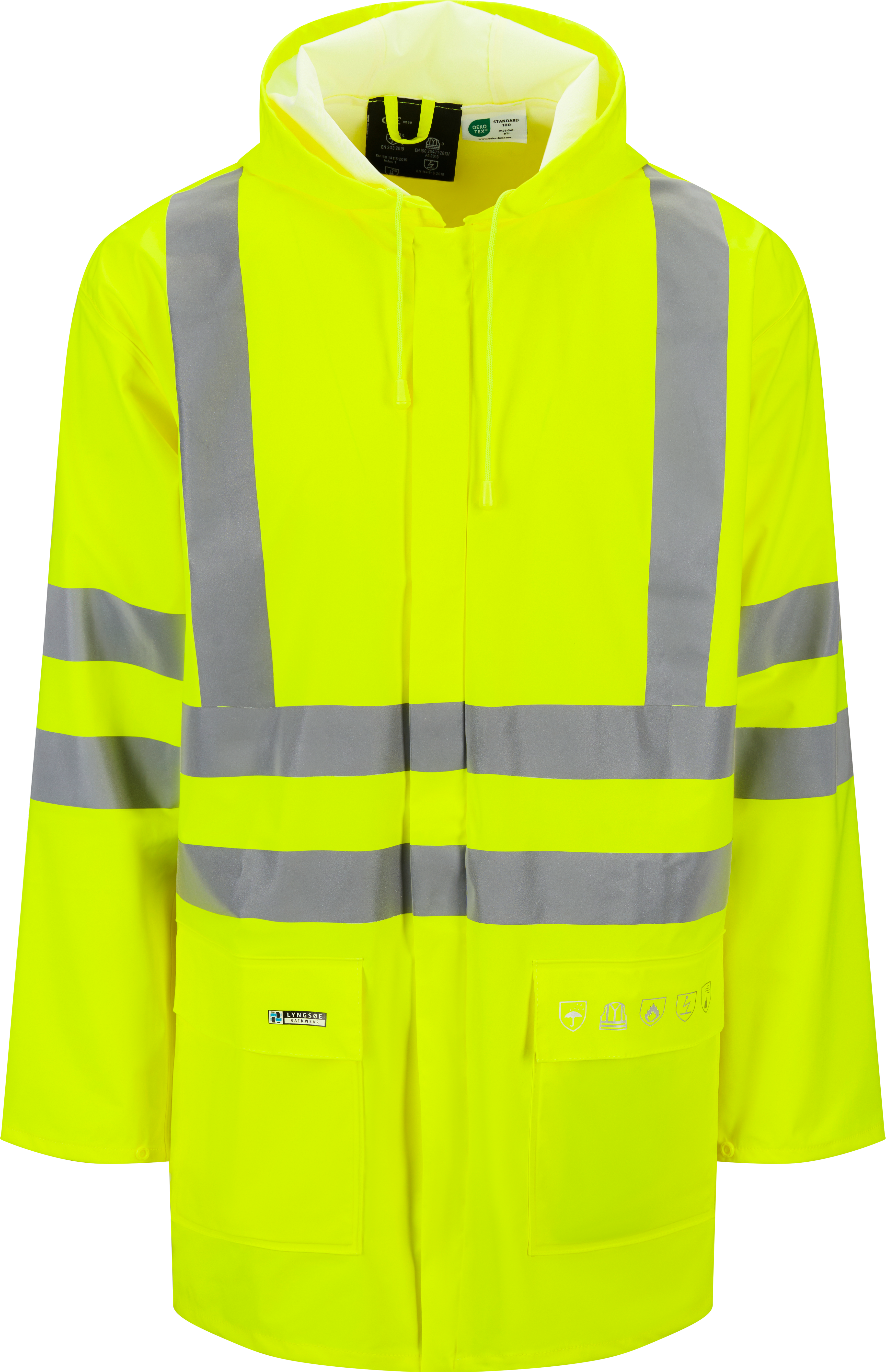 Flammhemmende, sichtbare Microflex-Regenjacke, angeschnittene Kapuze mit Kordeln, verdeckter Reißverschluss und Druckknopfverschluss, Druckknopfverstellung an den Ärmelbündchen, zwei Außentaschen, reflektierende Bänder an den Ärmelbündchen, um die Taille und über den Schultern, wasserdicht bei einer Wassersäule von 8000 mm.