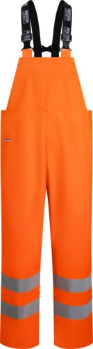 Microflex flammhemmende Signal-Latzhose. Elastische Schulterriemen mit Schnallen. Hochfrequenzgeschweißte Nähte. Druckknopfverstellung an den Knöcheln. Reflektorstreifen. Wasserdichtigkeit: 8000 mm.