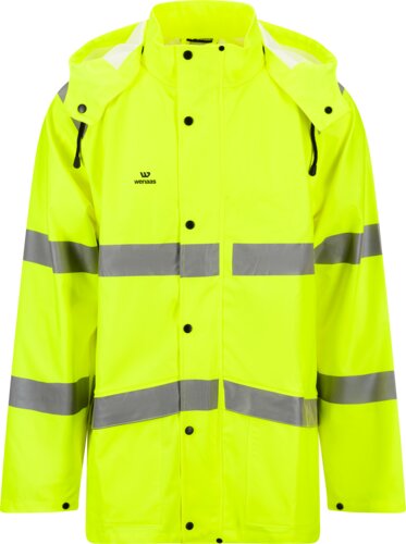 Warnschutzregenjacke mit Kragen, verstellbarer, abnehmbarer Kapuze, verdecktem Frontreißverschluss und durchgehender Windschutzleiste mit 6 Kunststoffdruckknöpfen. Zwei Taschen auf der Vorderseite mit großen Klappen und durchgehenden Reflektorstreifen. Handytasche in der rechten Vordertasche, Rückenpasse mit Belüftung, Ärmel mit Weitenregulierung an den Bündchen und Reflektorstreifen an Schultern, Ärmeln und Rumpf. Wassersäule: 8000 mm.