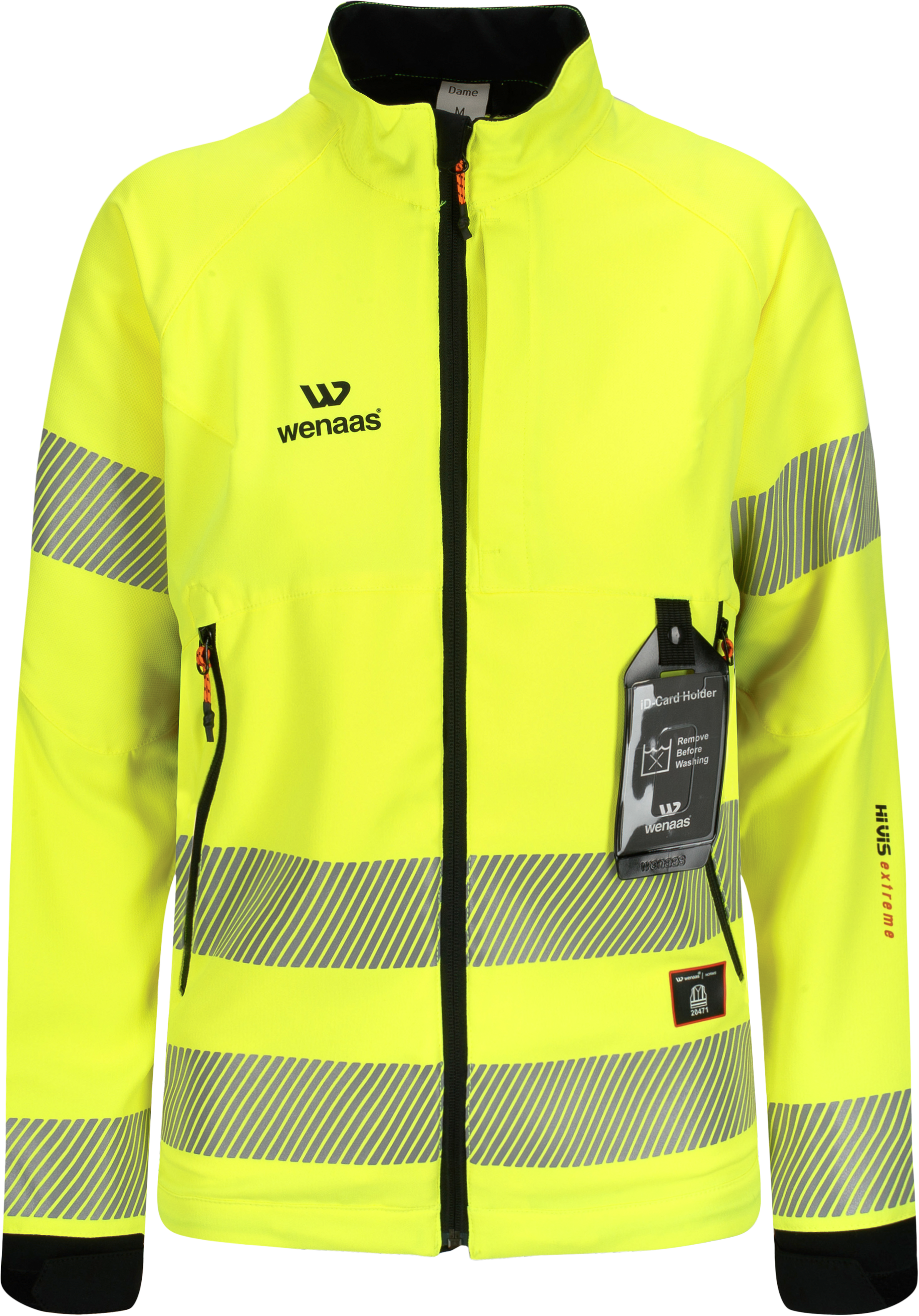 Ergonomisch gestaltete Warnschutzstretchjacke für Damen. Stehkragen, Reißverschluss an der Vorderseite mit einer Windschutzleiste innen und außen, abnehmbarer Ausweishalter und zwei Vordertaschen mit Reißverschluss. Lasergeschnittene Belüftungslöcher unter den Armen, Verstärkungen an den Ellbogen und an den hinteren Bündchen, elastische Bündchen mit Daumenöffnungen und Weitenregulierung an Ärmeln und Saum. Reflektierende Einsätze in zwei Höhen an Ärmeln und Rumpf.
