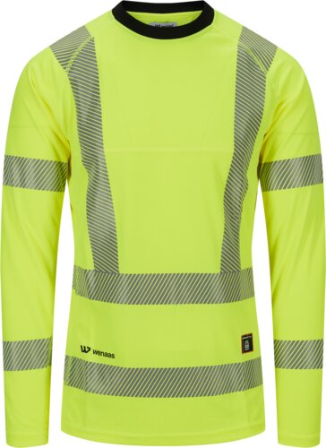 Ergonomisches Warnschutz-T-Shirt aus feuchtigkeitsableitendem Material mit langen Ärmeln, kontrastierendem Rundhalsausschnitt und zusätzlichem Belüftungseinsatz im Nacken und unter den Armen, segmentiertem Reflektorstreifen an Rumpf, Armen und Schultern.