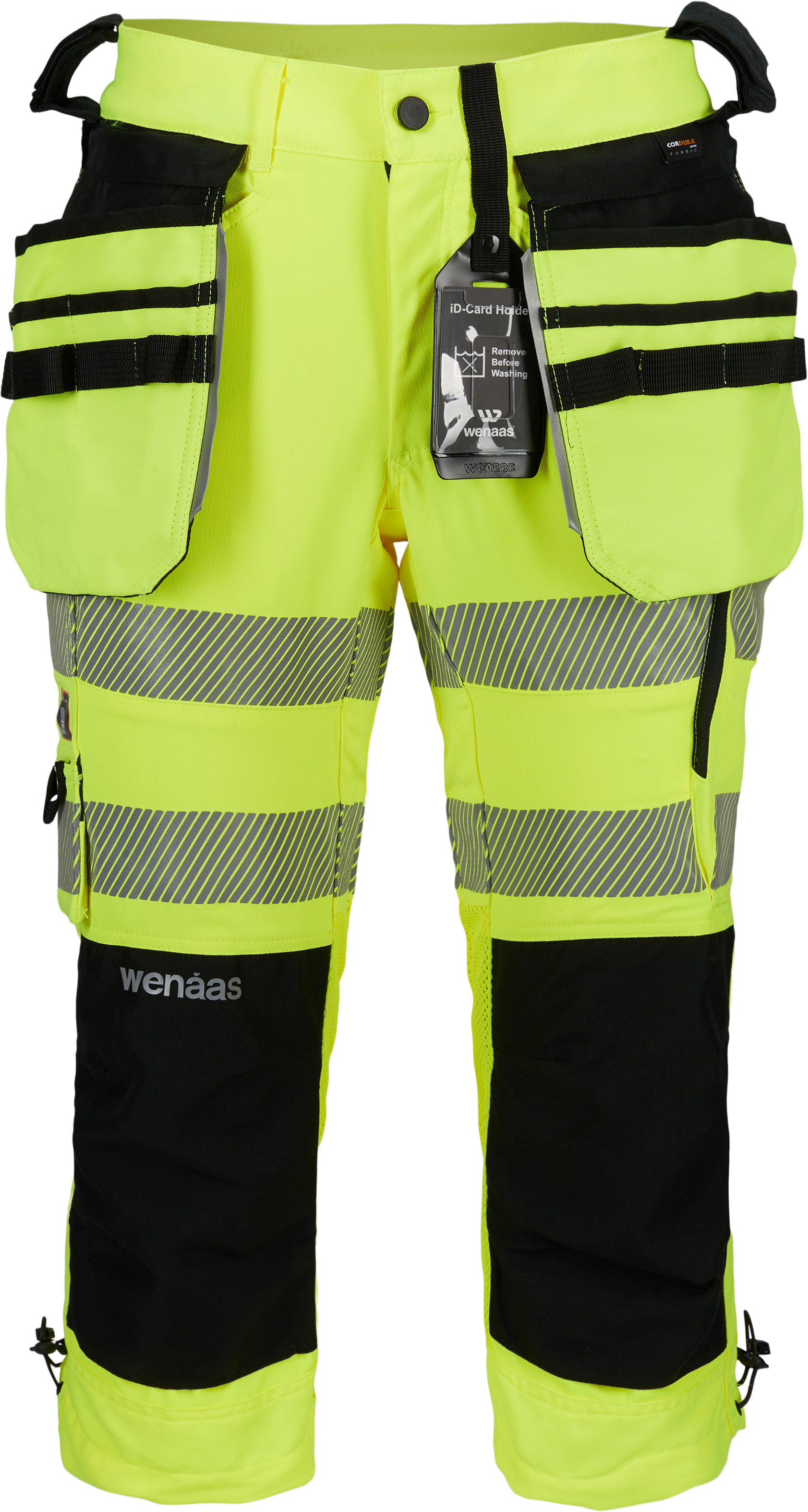 Schlanke ¾ lange Hose, bequeme Passform, gute Bewegungsfreiheit und gute Belüftung. Erhöhter Bund auf der Rückseite, Gürtelschlaufen und 2 Hammerhalter. Abnehmbarer Ausweishalter, abnehmbare Hängetaschen mit Werkzeugtaschen, Werkzeugschlaufen und reflektierender Rand. Die Hose hat Seitentaschen, 1 doppelte Oberschenkeltasche mit Reißverschluss und Patte, Gesäßtaschen mit reflektierendem Rand, Zollstocktasche und Kniepolstertaschen. Reflektierende Paspelierung in 2 Höhen und Weiteneinstellung am unteren Beinende.