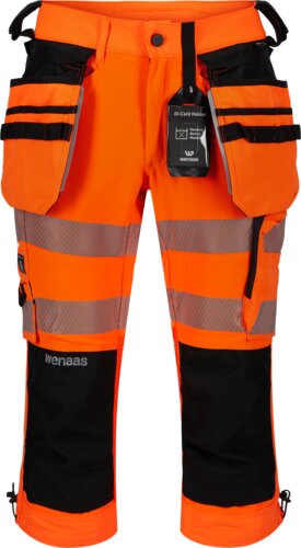 Schlanke ¾ lange Hose, bequeme Passform, gute Bewegungsfreiheit und gute Belüftung. Erhöhter Bund auf der Rückseite, Gürtelschlaufen und 2 Hammerhalter. Abnehmbarer Ausweishalter, abnehmbare Hängetaschen mit Werkzeugtaschen, Werkzeugschlaufen und reflektierender Rand. Die Hose hat Seitentaschen, 1 doppelte Oberschenkeltasche mit Reißverschluss und Patte, Gesäßtaschen mit reflektierendem Rand, Zollstocktasche und Kniepolstertaschen. Reflektierende Paspelierung in 2 Höhen und Weiteneinstellung am unteren Beinende.