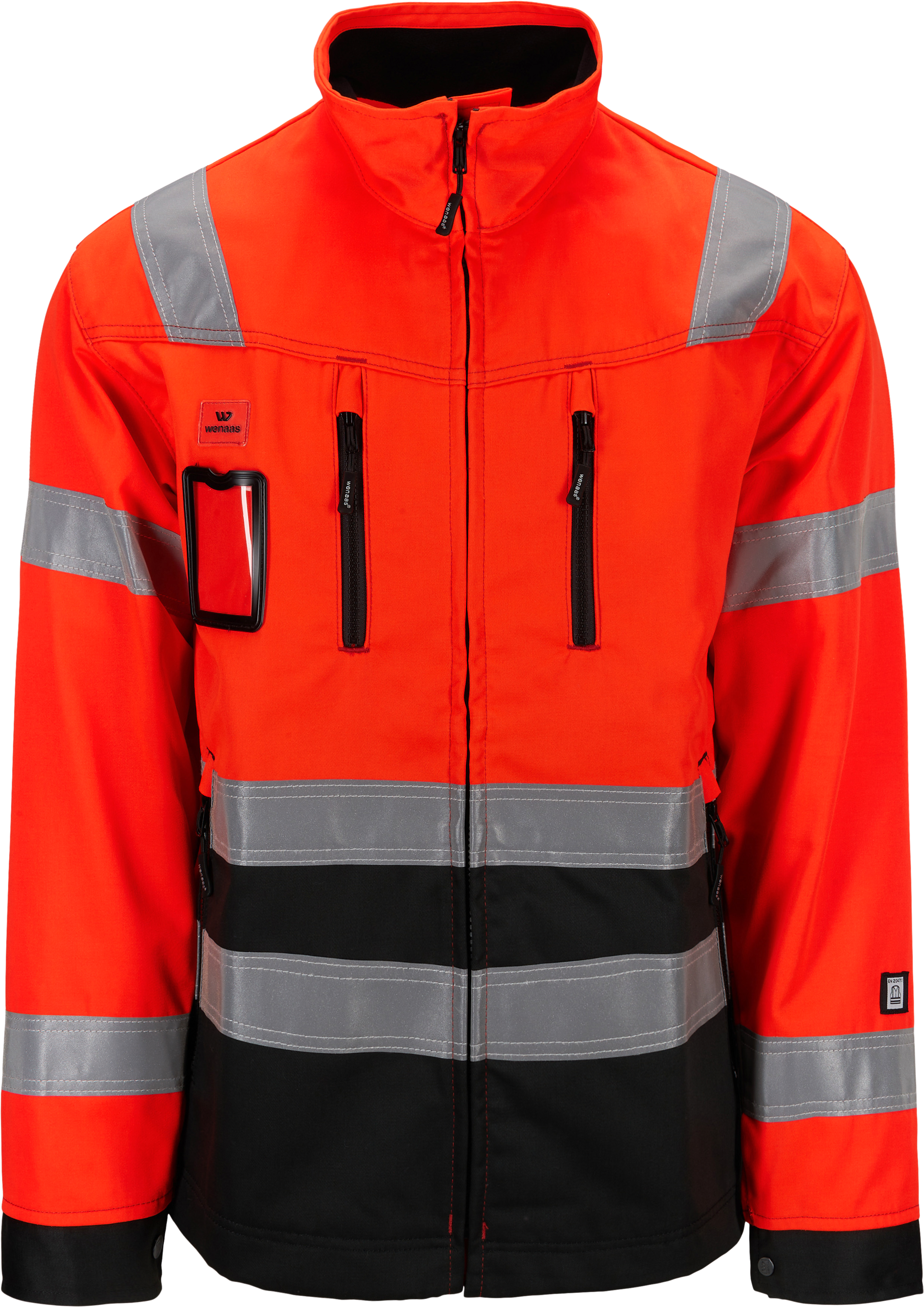 Warnschutzjacke mit reflektierenden Einsätzen an den Schultern, am Rumpf und an den Ärmeln. Reißverschluss auf der Vorderseite, zwei Seitentaschen mit Reißverschluss und Ausweistasche. Zwei große Innentaschen, eine davon rechts mit einer Handytasche. Auf der linken Seite befindet sich eine kleinere Innentasche mit einem Knopf. Verstellbare Druckknöpfe an den Bündchen, Zwickel an den Ärmeln und ein verlängertes Rückenteil. Druckknöpfe an der Taille zur Weitenregulierung.