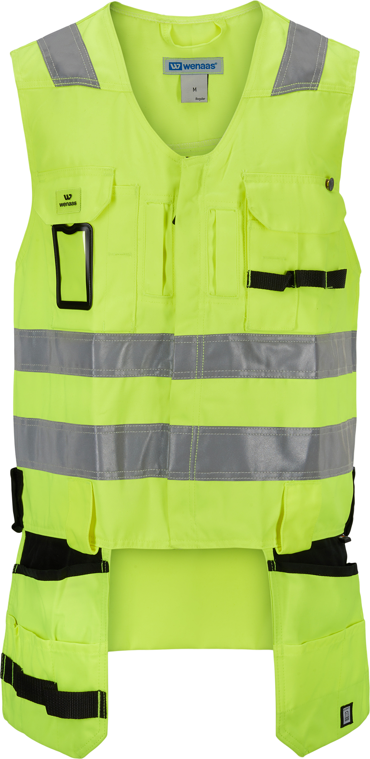 Warnschutzweste, geeignet für Arbeiten in der Höhe, reflektierende Einsätze über den Schultern und am Rumpf, verdeckter Frontreißverschluss mit Option auf Überbreite am äußeren Reißverschluss, Cordura®-Werkzeughalter, breite Gürtelschlaufen, zwei Brusttaschen mit Patte und Klettverschluss, rechte Tasche mit Dehnfalte, Bleistifttasche, linke Tasche mit Dehnfalte unten und an beiden Seiten, Bleistifttasche und Knopf für Messerschlitz, vier Cordura®-Hängetaschen, die rechte Vordertasche hat ein großes Fach und drei kleinere Fächer auf der Außenseite, die Außenseite der Tasche hat ein Gurtband in zwei verschiedenen Breiten, die linke Tasche hat ein großes Fach und zwei kleinere Fächer, verlängertes Rückenteil, Rückennetz zur Belüftung.
