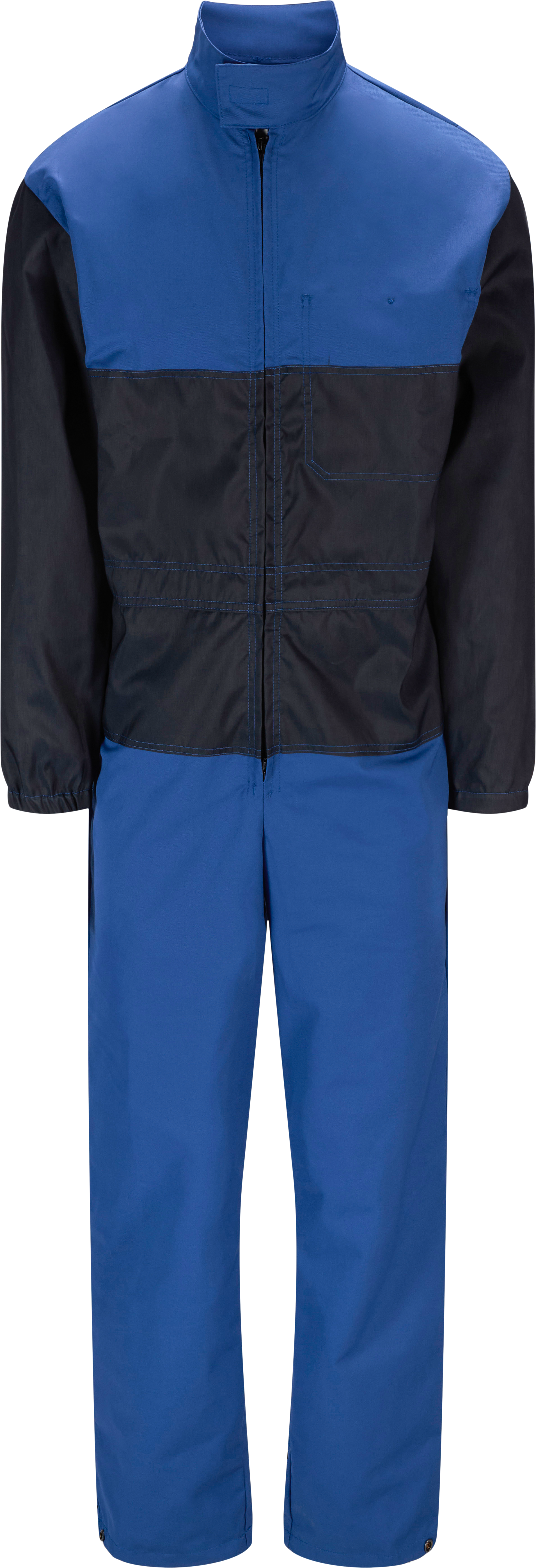 Comfortable, durable coverall. This coverall offers comfort as well as water-repellent characteristics and an anti-crease finish. Zip and Velcro closure at front and several practical pockets. Adjustable waist, sleeve cuffs, and leg hems. This coverall is suitable for fishery work.