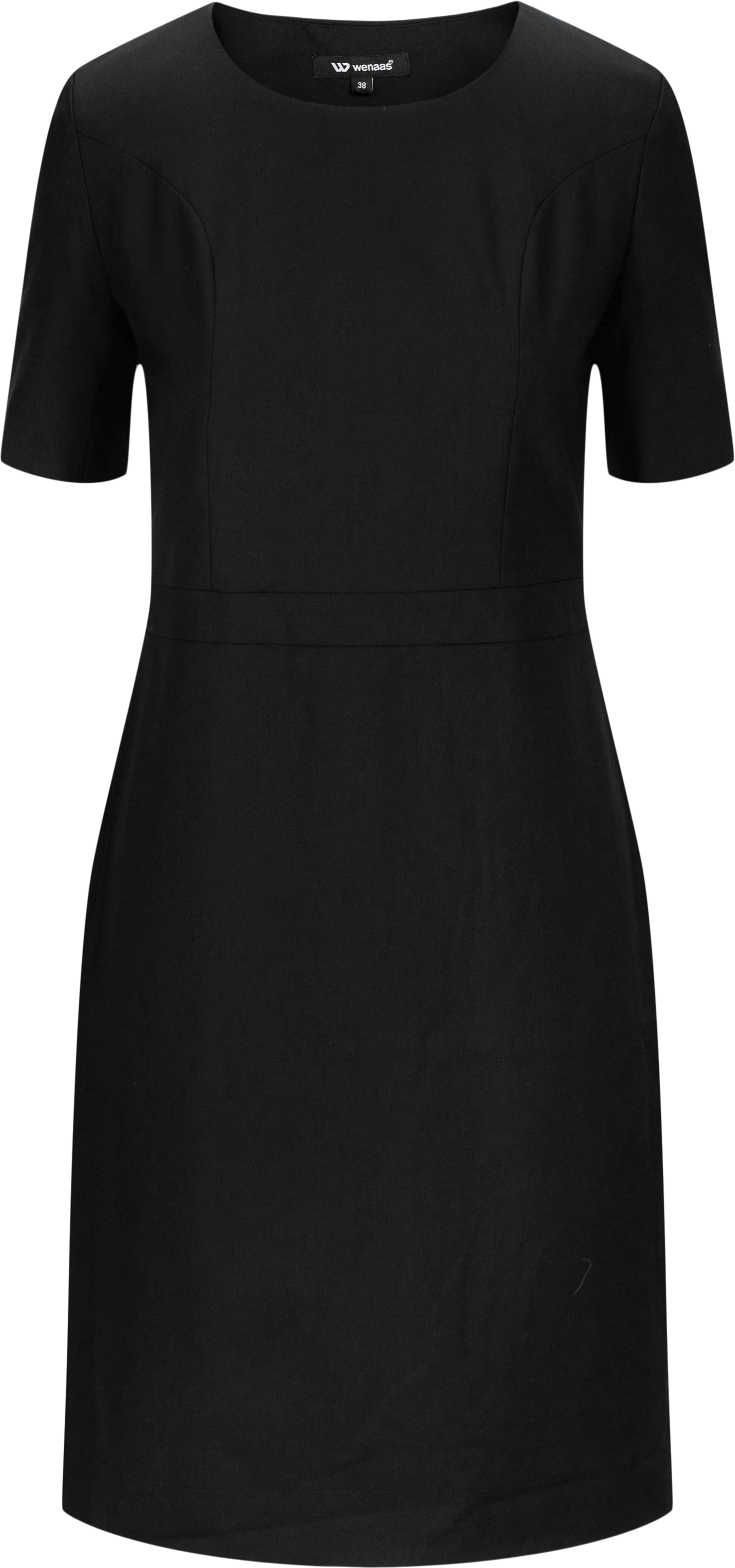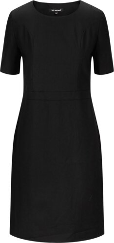 Knee-long tailored dress with short sleeves with a decorative button and slit on the sleeves. Princess seams in the front and back, elasticated waistband and zipper in the left side seam. Closed slit on the each side seam for improved mobility. The dress is lined with elastic lining. A stretchy fabric makes the dress comfortable and excellent movement.