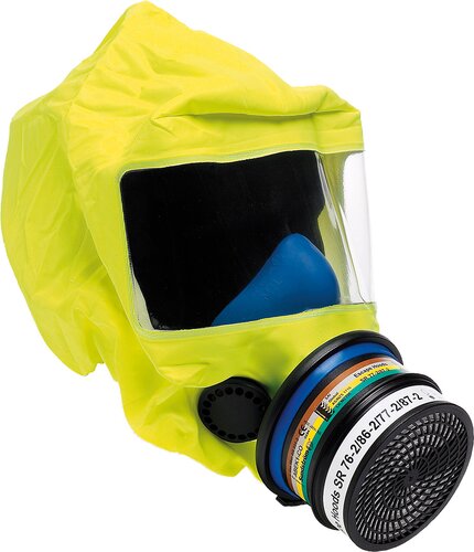 Escape hood SR 77-3 for self-rescue in the event of fire and/or chemical emission accident. Half mask with two exhalation valves. The Hood is flame retardant, and vacuum packaged in an aluminum bag. The aluminum bag gives a carefree use for 10 years with no need of service or maintenance. Filter can not be changed. Included: Gas filter SR 331-2 ABEK1-CO, particle filter SR 510 P3. and carrying bag.
