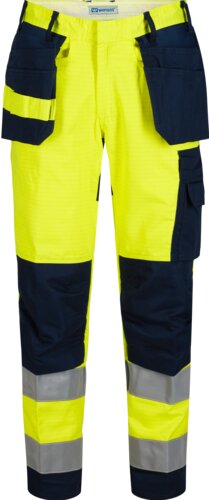 Flame retardant trousers with belt loops, and fly with plastic button and concealed zip, detachable hanging pockets with zip and toolholder, side pockets, and two back pockets. Double ruler pocket and double thigh pocket with flap, mobile phone pocket. Knee-pad pockets and reflective strip on leg.
