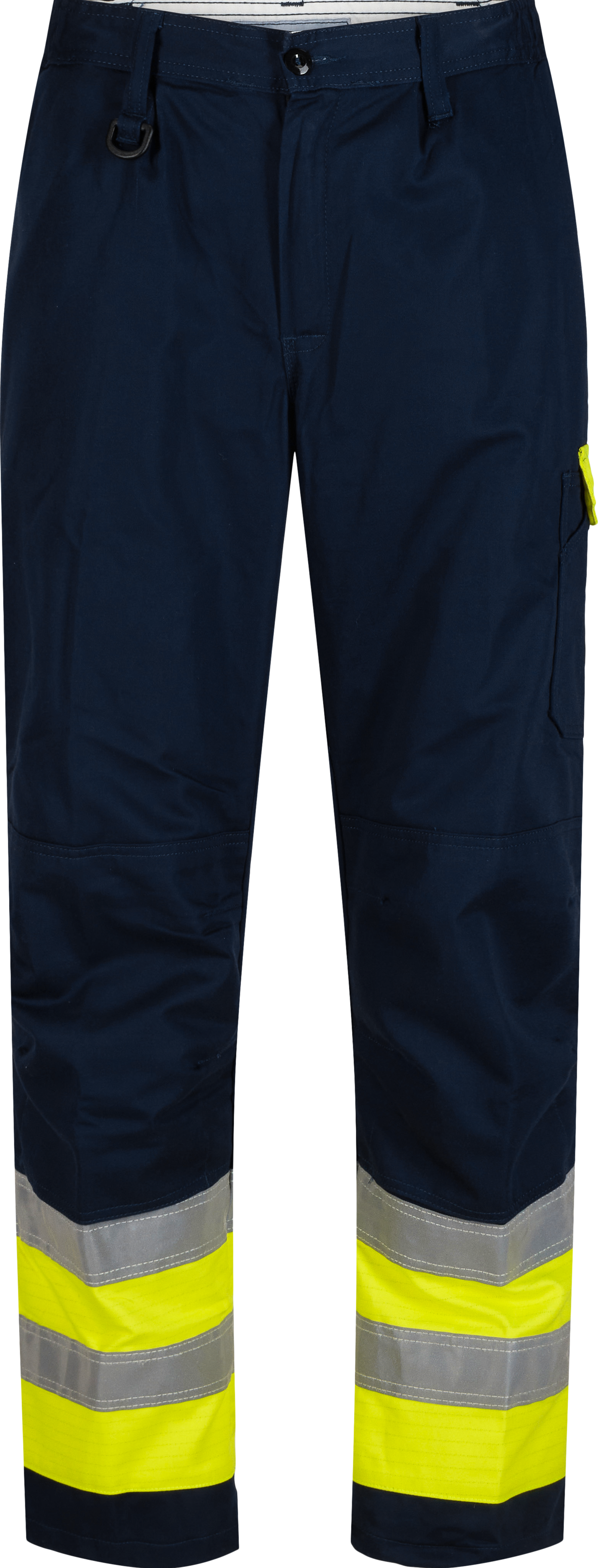 Flame retardant pants with seven belt loops, belt loop at front with D-ring, and waist with plastic button and elastication. Two side pockets and two back pockets, one with flap and Velcro® closure (right). Double tool pocket on right side with detached lower edge and small knife holder. Double, two-section left thigh pocket with flap and Velcro® closure. Mobile phone pocket, ID card pocket, pen pocket, and knee-pad pockets. Reflective strip around leg.
