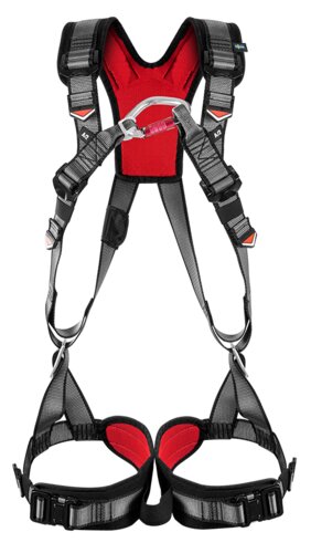 Breathable padding, quick-connect buckles, adjustable straps, galvanized side D-rings, PVC coated D-ring on back, aluminium carabiner in front, FID tag, 140 kg user weight.