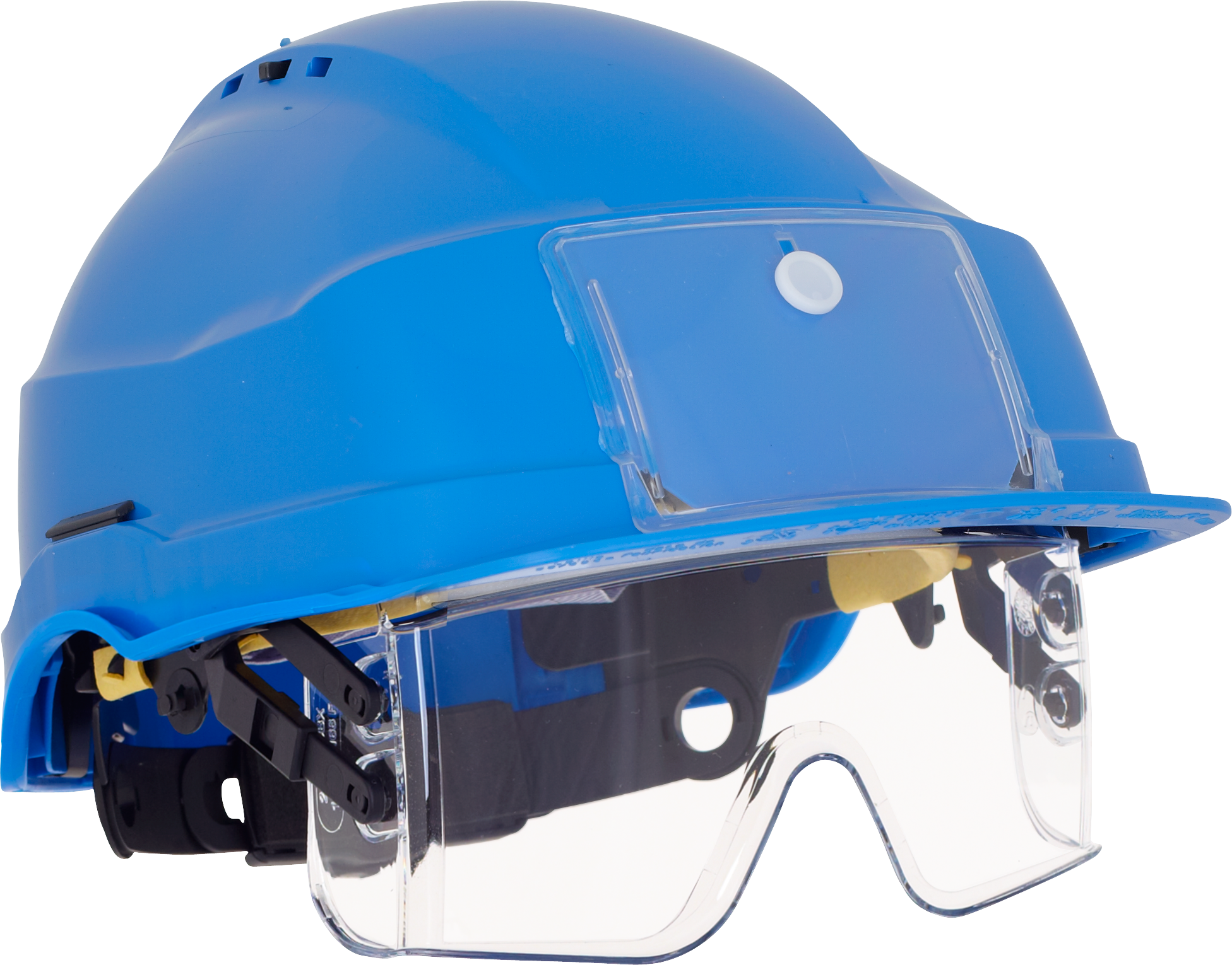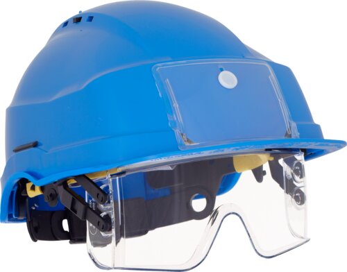 Ventilated helmet with ID-card pocket. Ventilation can be closed and opened. 6-point ratchet suspension. Integrated clear glasses in polycarbonate. Space for optical glasses underneath glasses. Padded comfort band in fake leather. 30 mm slot for attachment of accessories. Size 52-64 cm.