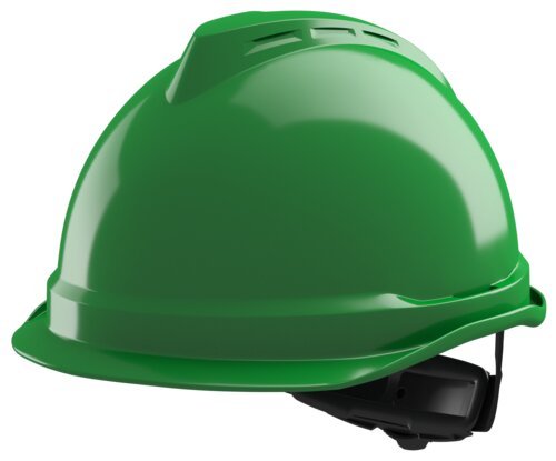 Unventilated 1000-volt safety helmet from V-Gard. 4-point Fas-Trac® III ratchet suspension with PVC comfort band. Integrated peak and rain channel. Protection against lateral deformation (LD). Size 52–63 cm.