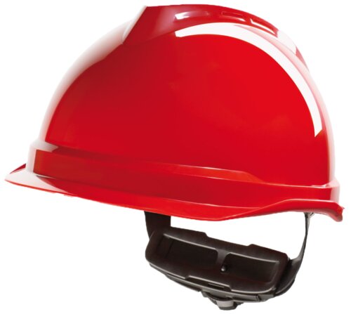 Unventilated 1000-volt safety helmet from V-Gard. 4-point Fas-Trac® III ratchet suspension with PVC comfort band. Integrated peak and rain channel. Protection against lateral deformation (LD). Size 52–63 cm.