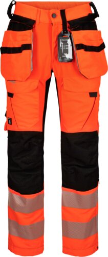 Hi-vis stretch trousers in a slim fit with ventilation patches, high-waisted in the back, belt loops, two hammer loops, detachable hanging pockets with tool pockets and loops, side pockets, thigh pockets in the front, back pockets, ruler pocket, mobile phone pocket, knee-pad pockets with two levels, segmented reflective bands on two places, length and width adjustment at the hems.