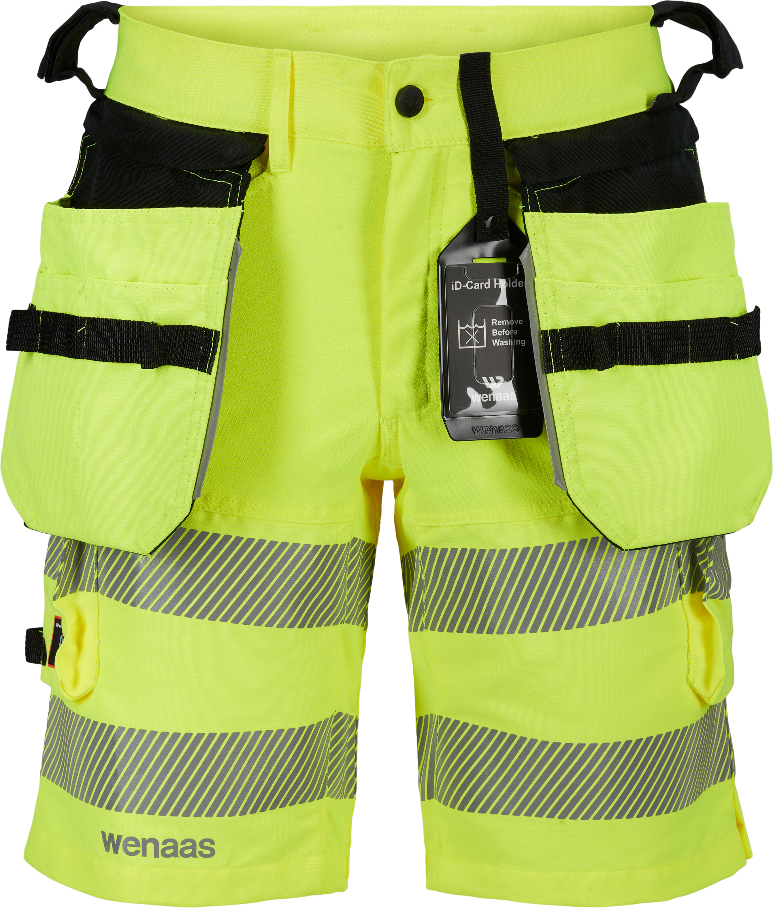 Hi-vis shorts in a wide fit, high-waisted in the back, belt loops, two hammer loops, detachable ID-card pocket, detachable hanging pockets with tool pockets and loops, side pockets, thigh pockets with flaps, thigh pockets with zips, back pockets with zips and reflective piping on thighs at two levels.