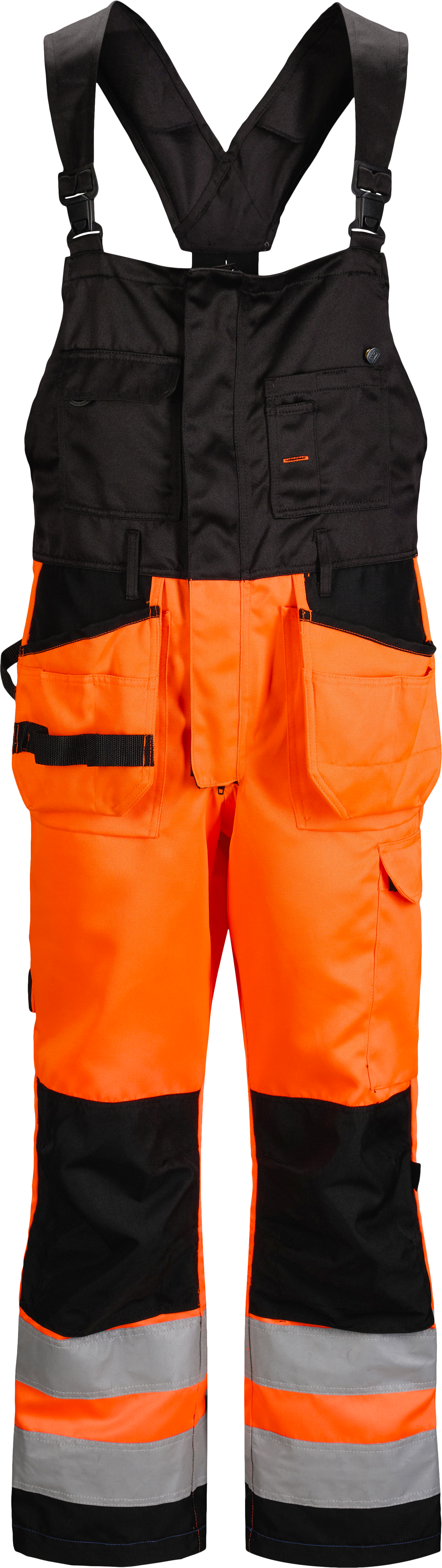 Bib'n'brace with a high front and zipper closure under the front flap. High back, adjustable straps with quick-release closure at the front, and belt loops around the waist. Multiple practical pockets and adjustment options.