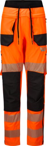These Hi-vis stretch trousers are made from elastic, 4-way stretch fabric, with reinforcements on the pockets, knees, and inner legs, and have a slim, ergonomic fit. They feature ventilating panels, two large front and back pockets, a mobile phone pocket, tool pocket and knee-pad pockets, as well as width adjustment at the waist and hems and three reflective stripes around the leg.