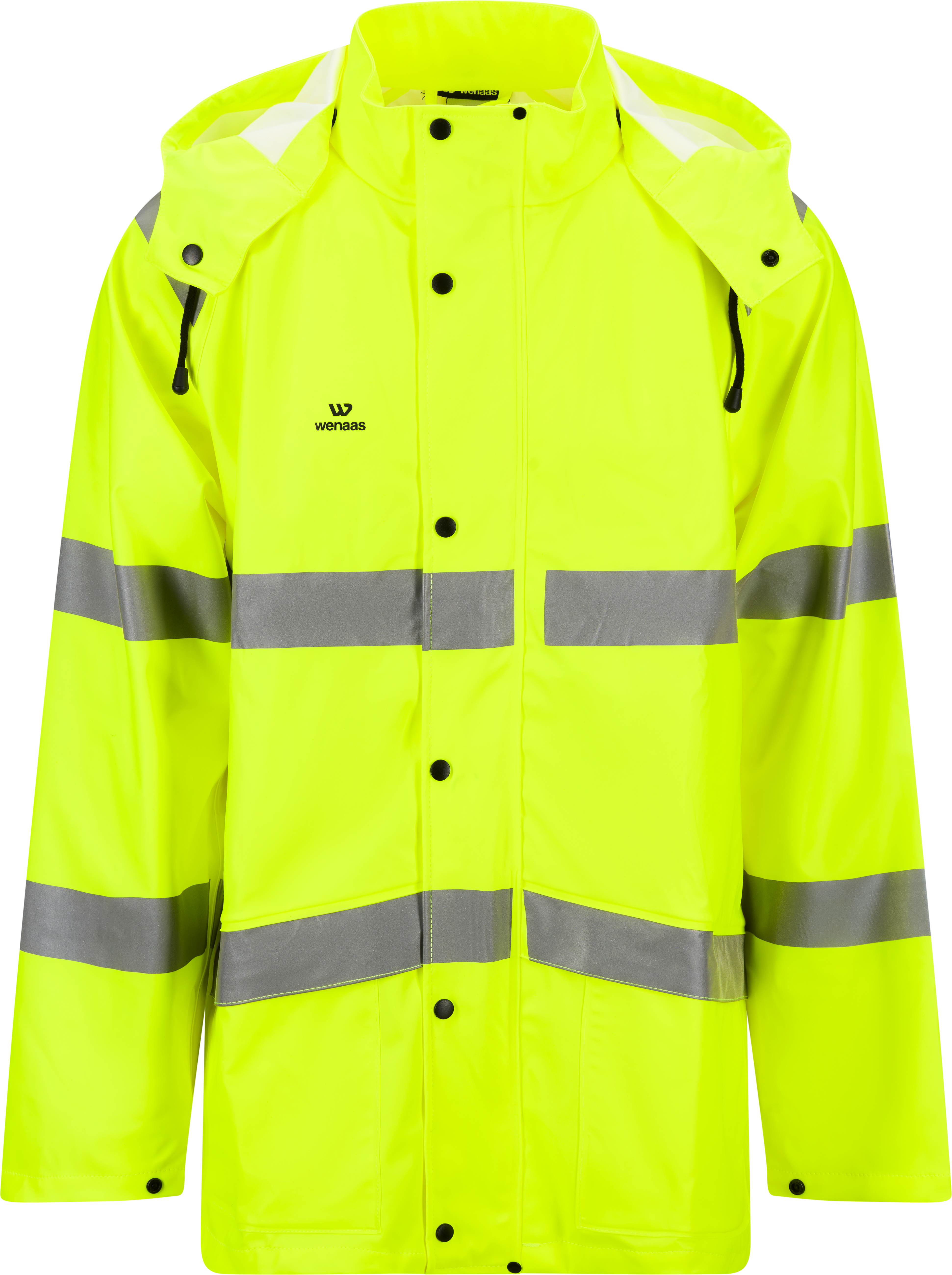 Hi-vis rain jacket with collar, adjustable, detachable hood, concealed front zip, and full-length storm flap with 6 plastic press-studs. Two pockets at front with large flaps with full-length reflective stripes. Mobile pocket inside right front pocket, yoke at back with ventilation, sleeves with width adjustment at cuffs, and reflective stripes on shoulders, sleeves, and torso. Water column: 8000mm.