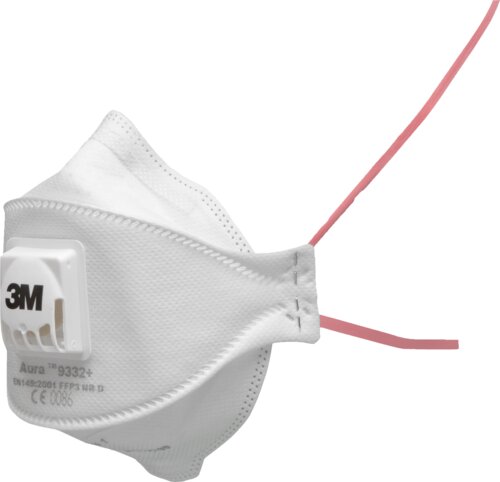 FFP3 NR D disposable dust mask with Cool Flow™ comfort valve to reduce heat buildup. Folds flat. Three-panel design to fit a variety of face shapes. Curved upper panel. Protection from particles and aerosols. Two red earloops, soft nose pad, and integrated nose clip. Package containing 12 boxes with 10 units each.