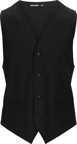 Elegant vest with stretch for men. Comfortable vest with v-neck, princess seams in the front and back and two double besom pockets. Adjustable belt and double-layered elastic lining on the back. Closure with five buttons in the front.