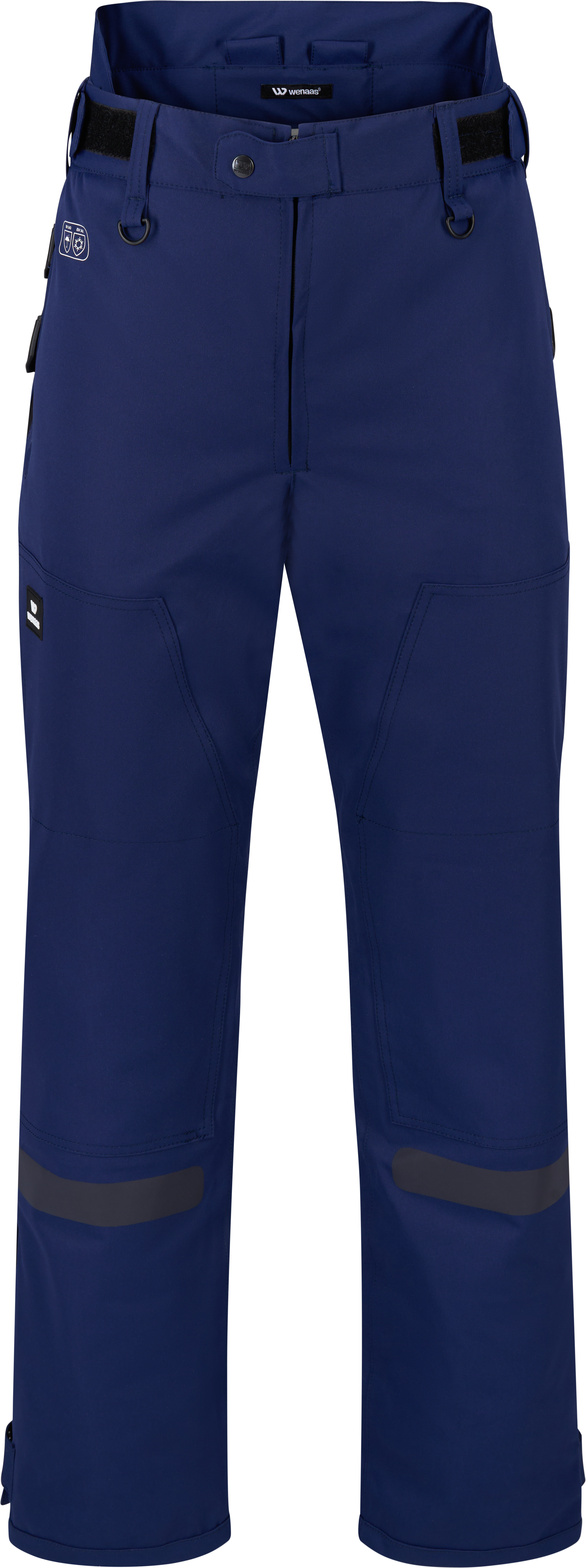 Trousers with quilted lining, taped seams in the outer fabric, loops front and back for detachable suspenders, waistband with belt loops and D-ring, raised back waist, waistband adjustable with hook-and-loop straps and elastic inside, front closure with zipper and press button at waist, front pockets with concealed zipper under flap with reflective piping, back yoke, extra reinforcement front and back, 35 mm tone-on-tone reflective tape with main colour front and back on legs, side seams with zippers from waistband to hem with strap for adjustment at leg openings.