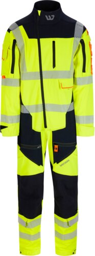 This coverall has a standing collar, a long zipper in front up to the top of the collar, with flaps covering the zipper over and under. Chest pocket at the left side with a zipper, a front pocket with flap and opening to access to inner garments, thigh pockets closed with a zipper, a WEB band with D-ring for an ID card holder, large sleeve pockets with a zipper, the right side pocket has a radio pocket with flap and a WEB band at the bottom of this pocket and two buttonholes on top. The left sleeve pocket has a radio loop and a vertical WEB band strap with four openings for hanging tools, leg pockets with flaps, ventilation opening with zipper at the knee, knee-pad pockets for two levels, adjustable sleeves, and bottom legs, reflex tape on the body, shoulder, sleeves, and legs.