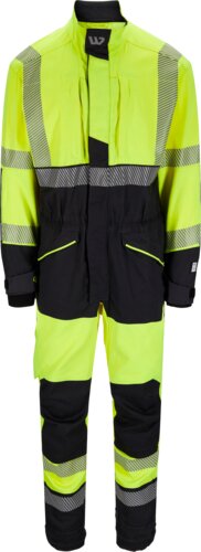 Flame-resistant coverall in stretch fabric, arc protection, welding protection class 1, stand-up collar, zipper between front flaps up to the top of the collar, elastic waistband, chest pockets with concealed zipper, loop and buttonhole on the lower part of the pocket bag, front pockets with flap, map pocket with zipper, mobile pocket, loop and buttonhole for cable entry into the chest pocket, inside pocket with zipper, sleeves with reinforcement on the elbows, tabs for width adjustment, ribbed cuffs with thumb opening, knee pad pockets with two levels for knee pads in different sizes, adjustable width and length at the bottom of the legs, legs can be extended by 5 cm, segmented transfer reflective tape around the body, sleeves, over the shoulders, and legs.