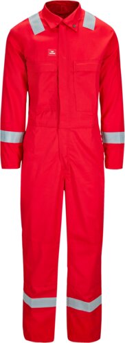 Comfortable flame-retardant coverall with hidden two-way zippers in the front. Extended fold in the back provide better movement, inner loops and several practical pockets, among others to knee pads. Adjustable waist with elastication ensures good comfort. Adjustable cuffs. This coverall is suitable for work requiring protection against arcs and flames.