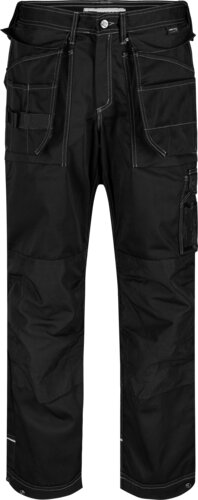 Reflective piping at bottom legs. Zipper at fly. Tool holders with Velcro on the side in reinforced Cordura fabric. Two hanging pockets, with added reinforced Cordura fabric, with possibility to remove with zipper and button. Right pocket has one big pocket, web band and three smaller pockets. Left pocket has two large pockets. Front pocket with slanted opening to fit the hanging pocket. Two back pockets. Leg pocket with flap and mobile phone pocket and one smaller pocket. ID pocket on the right leg. Rulerpocket with Button knife. Pen pocket. Knee pockets in reinforced Cordura fabric, with two height options. Push-button adjustment at hem, reinforced Cordura fabric at back bottom legs.