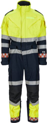Durable, flame-retardant rescue coverall with an extended 2-way zip at front. High collar, tab and padding on shoulders, and box pleat at back for added freedom of movement. Detachable braces, radio antenna holder, and several practical pockets. Form-stitched elbow and knee sections with aramid reinforcements. Adjustable waist, sleeve cuffs, and leg hems. Suitable for fire and rescue work.