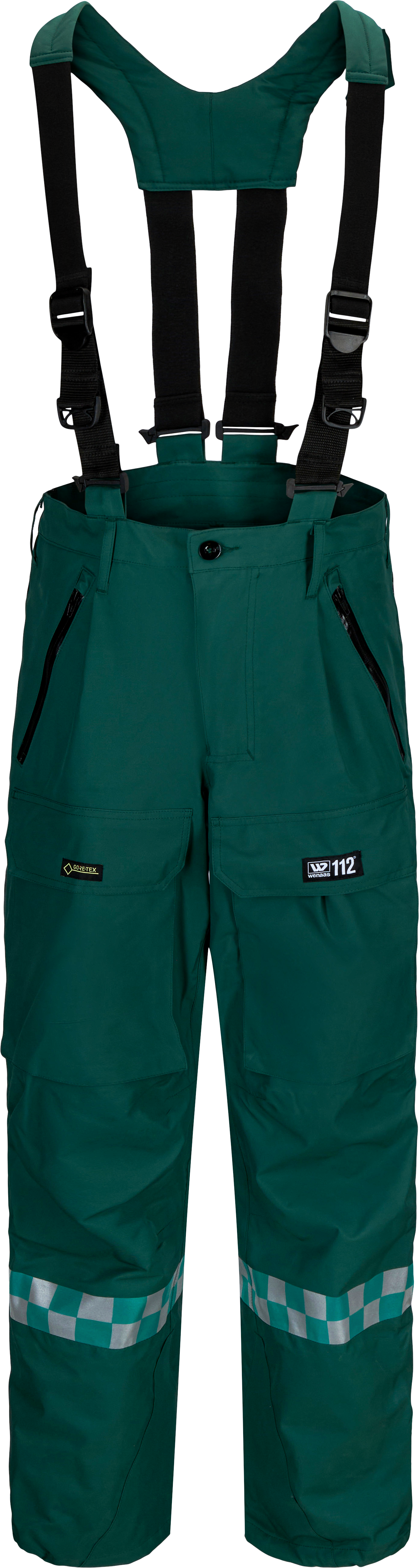 Year-round GoreTex trousers for all weather conditions. Comfortable and practical fit. Regular waist height in the front and high in the back. Long waterproof zippers on the sides from ankle to hip. Front thigh pockets. Reinforced with durable panels in exposed areas. Snow gaiters and zip adjustment at the bottom of the legs. Health and safety reflective details. Detachable suspenders included.