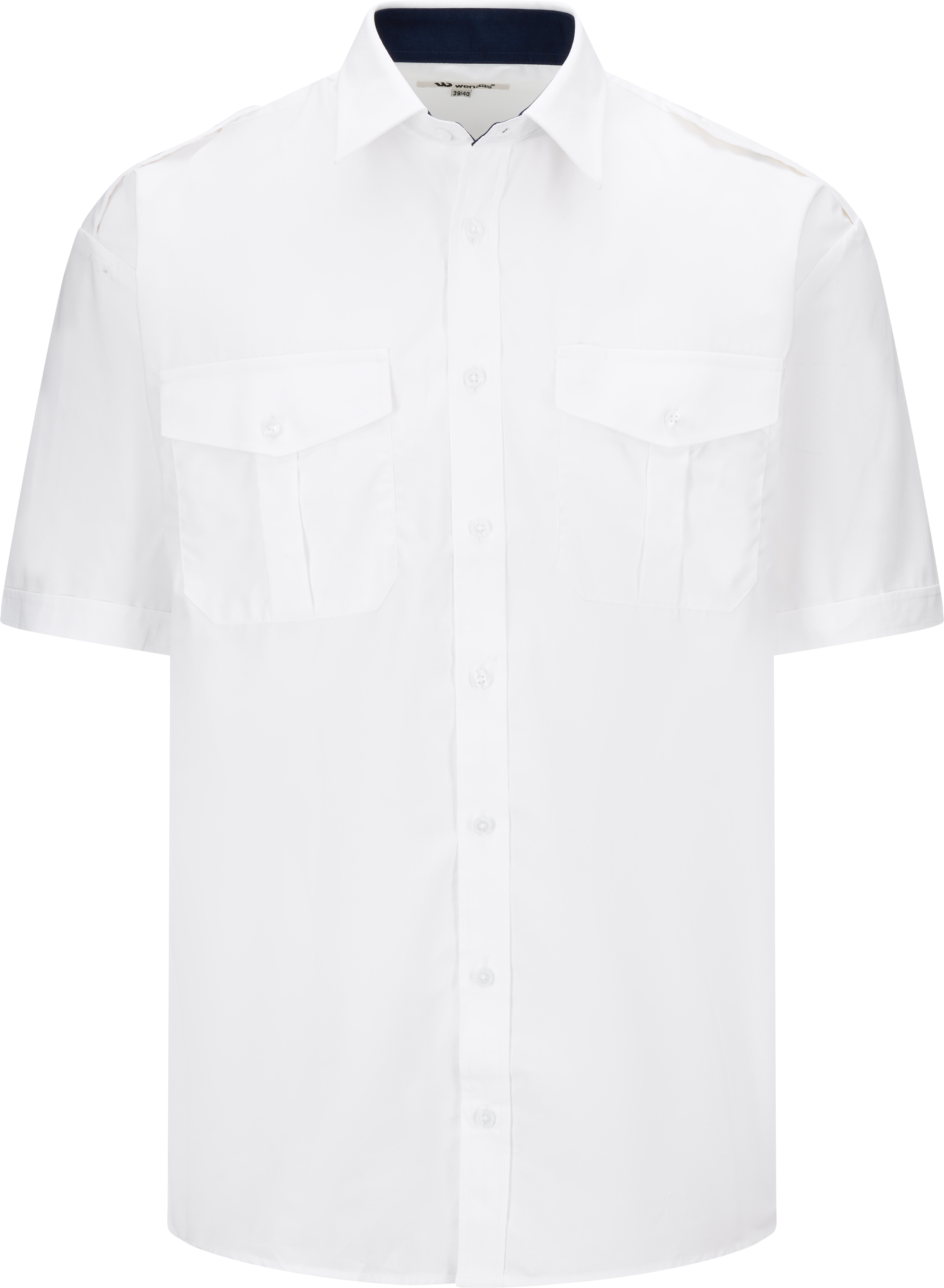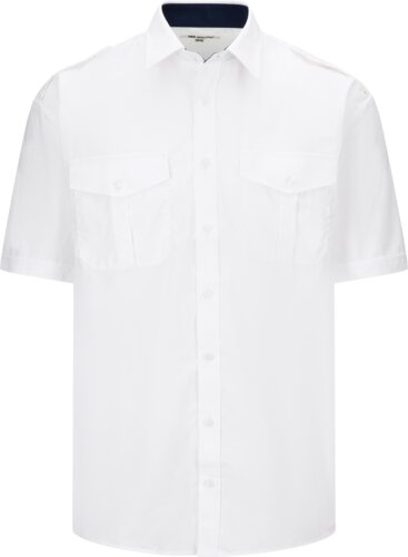 Regular fitted men’s shirt with short sleeves, point collar, shoulder flaps, back yoke, back pleat for improved mobility, front placket with buttons, chest pockets with flap and button closure, curved hem at front and back, contrasting collar tape in navy blue. ETI finish - '' Easy to iron''.