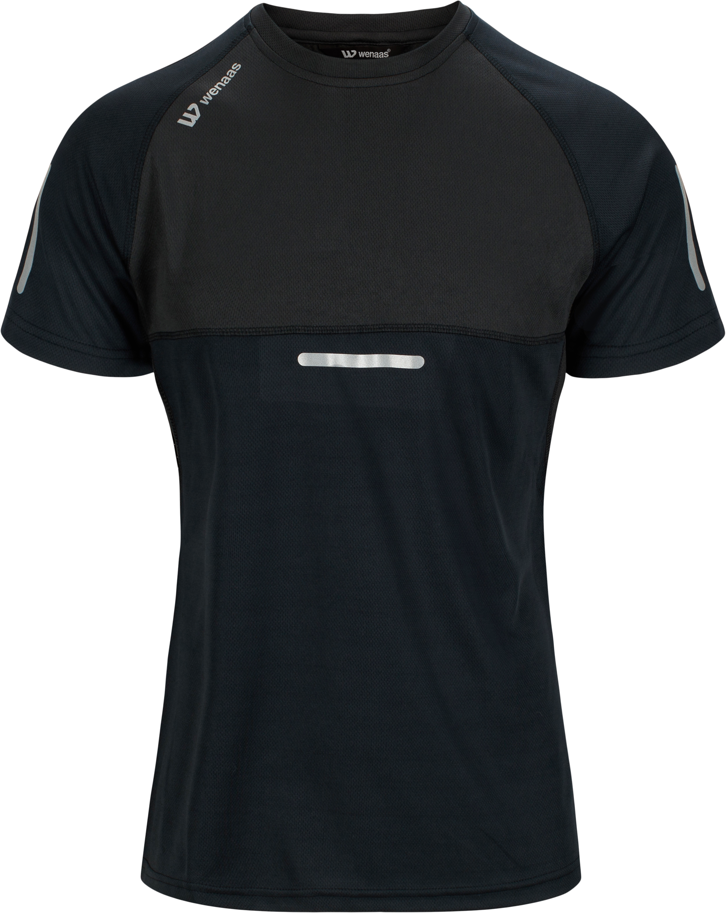 Lightweight and moisture absorbing t-shirt in a mesh fabric, round neck, short sleeves, extra ventilating mesh panel in neck and under sleeves. Short, thin reflective bands on torso and sleeves.