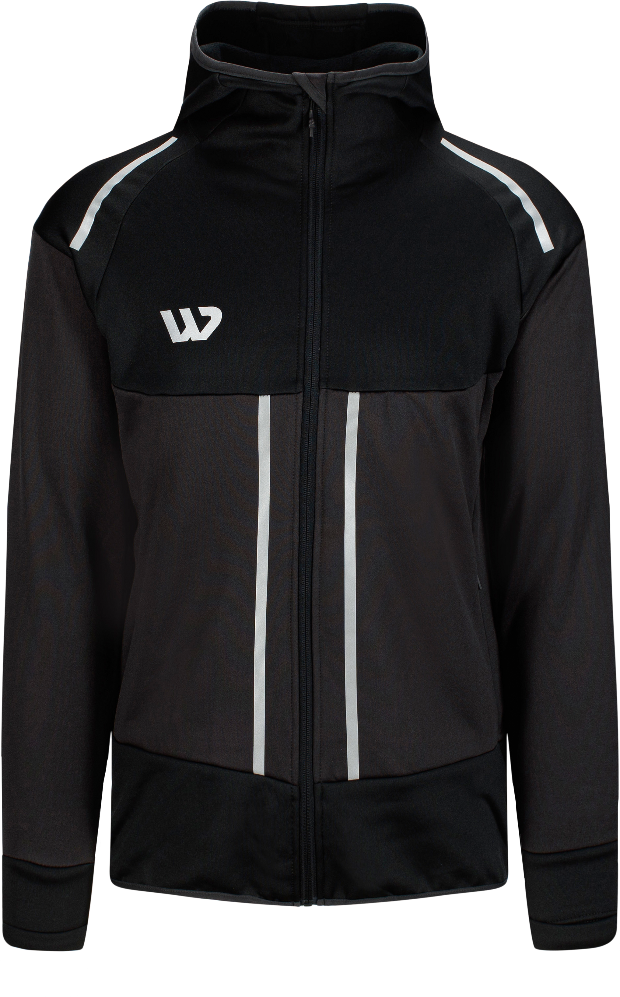 Stretch fleece jacket, tight fitting, with a standing collar with hood, zipper in the front, long ragland sleeves, thumb holes, two front pockets with zipper, contrasting material in the back panel, extended back and small reflective details for extra visibility.