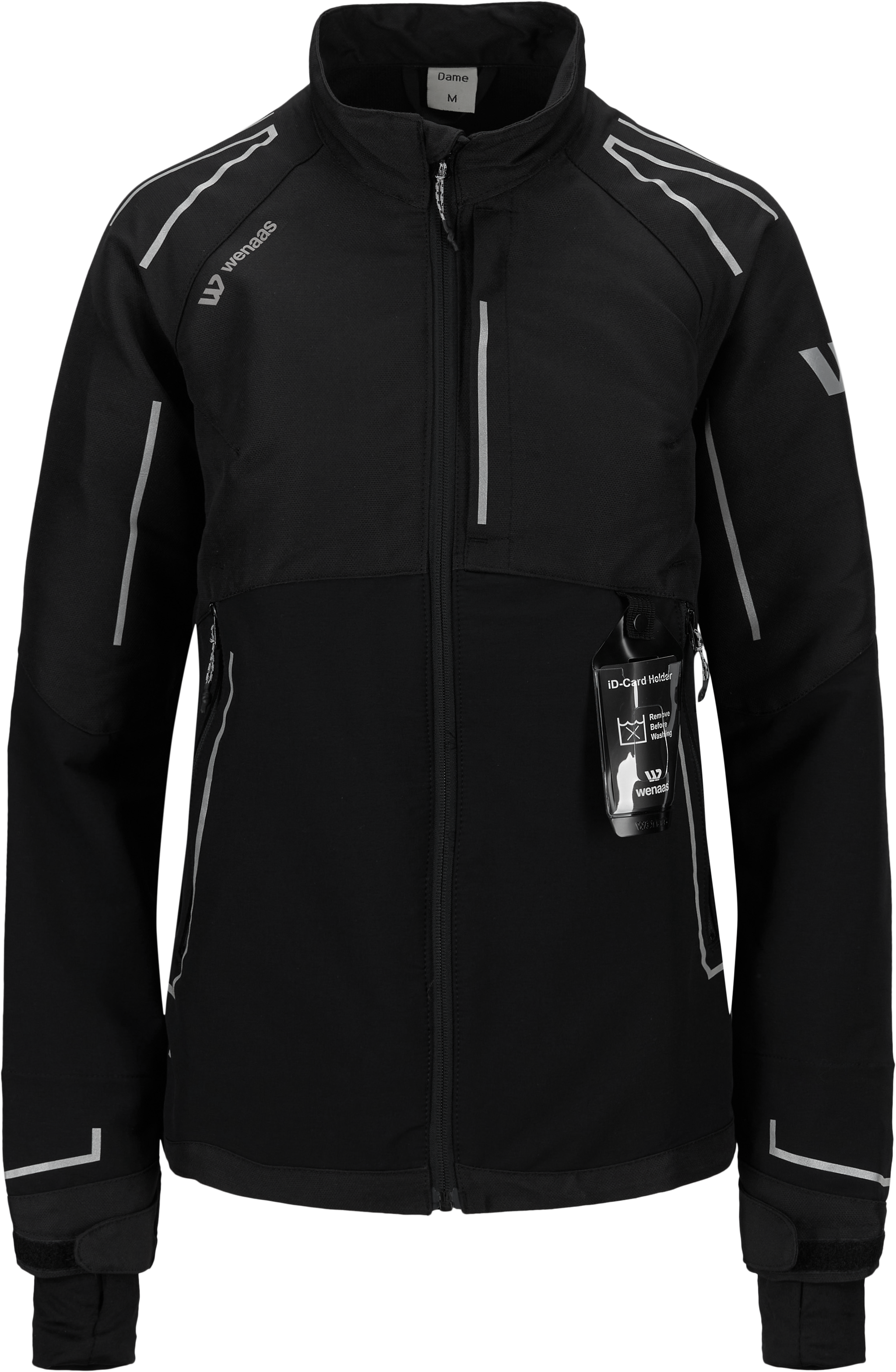 This lady’s stretch jacket has a standing collar, ''CURVED'' - embroidery logo at the collar’s center back, a front zipper up to the collar top, a flap under the zipper for protection, reinforced sleeves elbow, rib cuffs with a thumb opening, and straps for adjustment at the hemline. Chest pocket, and front pockets with zippers. A curved body fit, a lengthened back, with adjustment of the width at the bottom waistline, a reflective logo, and slim decorative reflective stripes on the front, the back, and the sleeves for better visibility and protection.