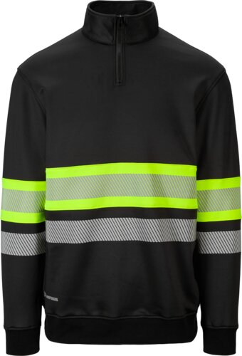 Unisex 1/2 zip sweater with a stand-up collar and a front zipper. Two front pockets with zippers. The sleeves and hem have double-folded ribbed cuffs and waistband. Contrast fabric around the torso and sleeves with HT-segmented reflective strips placed in the middle and just below the contrast area.