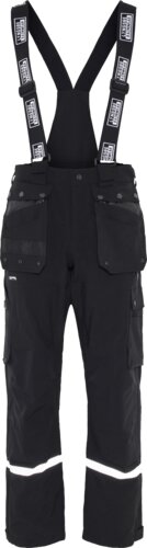 Breathable Rain Trouser in stretch quality. Detachable braces. Elastic sides in waist. Belt loops. Two back pockets with velcro. Hammer and knife hoop on left leg. Two front pockets. Two detachable nail pockets. Cargo pocket with press studs on leg. Kneepad pockets. Zipper at ankles. Velcro adjustments at ankles. Front fly with zipper and button. Reflective details.