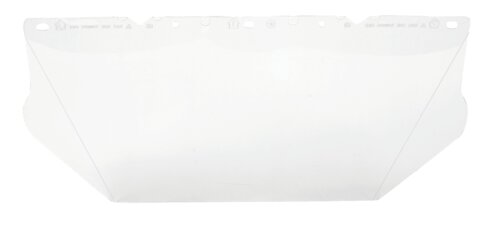 Clear polycarbonate face shield, protects against impact. Optical Class 1. Thickness 1 mm. 203 x 432 mm. Weight 90 g. Can be combined with the MSA face-shield holder. Attaches to a 30-mm slot on a helmet or to ear protection. Package contains 10 units.