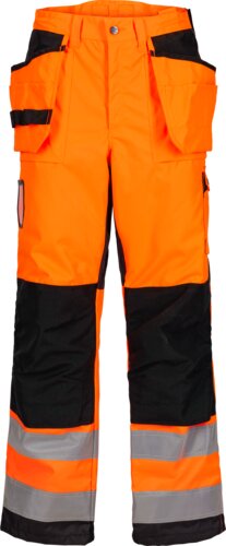 Winter-lined Hi-vis trousers. Fly with zip and button, higher waist at back with attachment points for trouser braces 19567-156-10, elastic at sides, and concealed zip along outer legs with Velcro® tabs and CORDURA® at hems. Toolholders at side, Two CORDURA®-reinforced hanging pockets, the right one with a large pocket and three smaller pockets, with outer webbing designed for storing various types of tools, and the left one with two small pockets on the outside for smaller tools. Side pockets, ID-card pocket on right leg, thigh pocket on left leg with flap, mobile phone pocket and smaller pocket, and two back pockets with flap, the right with ruler pocket with button for knife sheath and pencil pocket. Reflective section at hem, maximum logo area 20 x 25 cm.