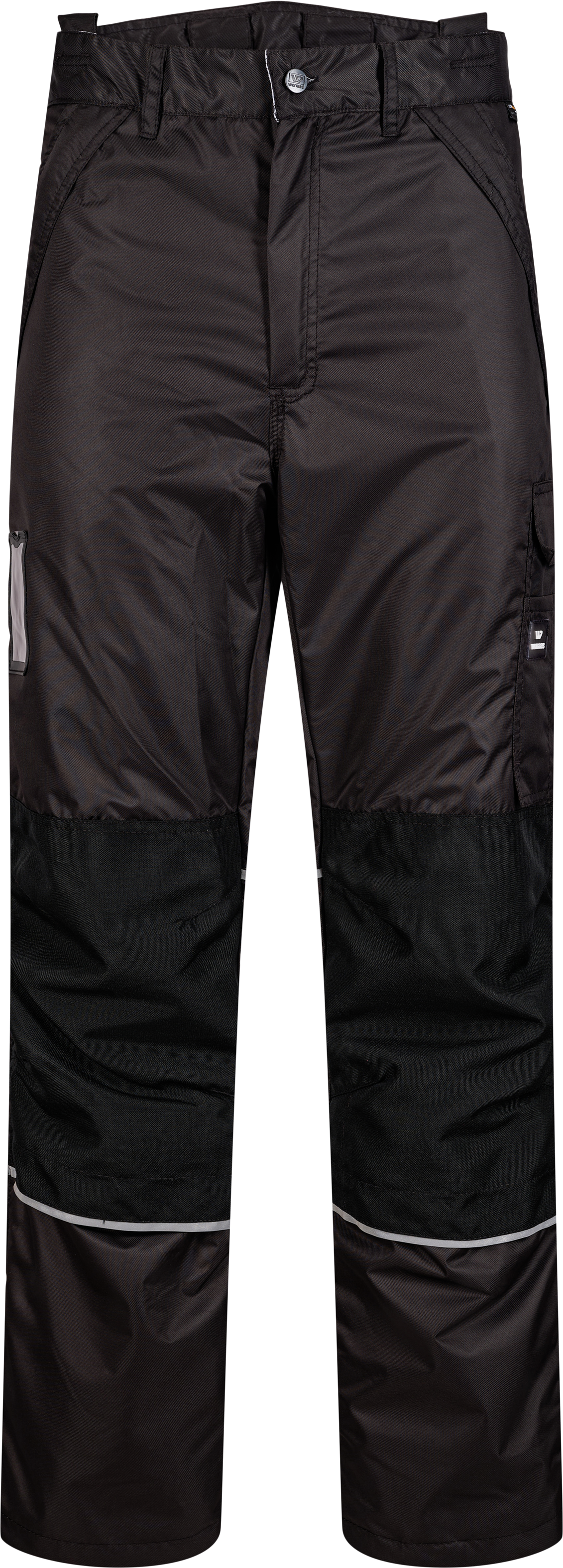 This winter-lined model has a waistband, elastic in the waistline, belt loops, button in front, and zip in the fly. The trouser has a higher waist at back, big loops for braces on the inside of the waist front, and back, and yoke at back, front pockets with zippers under flaps, a double hip pocket on the left side with a flap, ID-card pocket, adjustable knee pad pockets for two levels, and zipper outside of the lower legs under a flap. Reflective details at the bottom line of knee pad pockets and at the back of legs. Adjustable leg width, moist barrier on the bottom legs. The knee pad pocket and the bottom part of the back legs are made with reinforcement fabric.