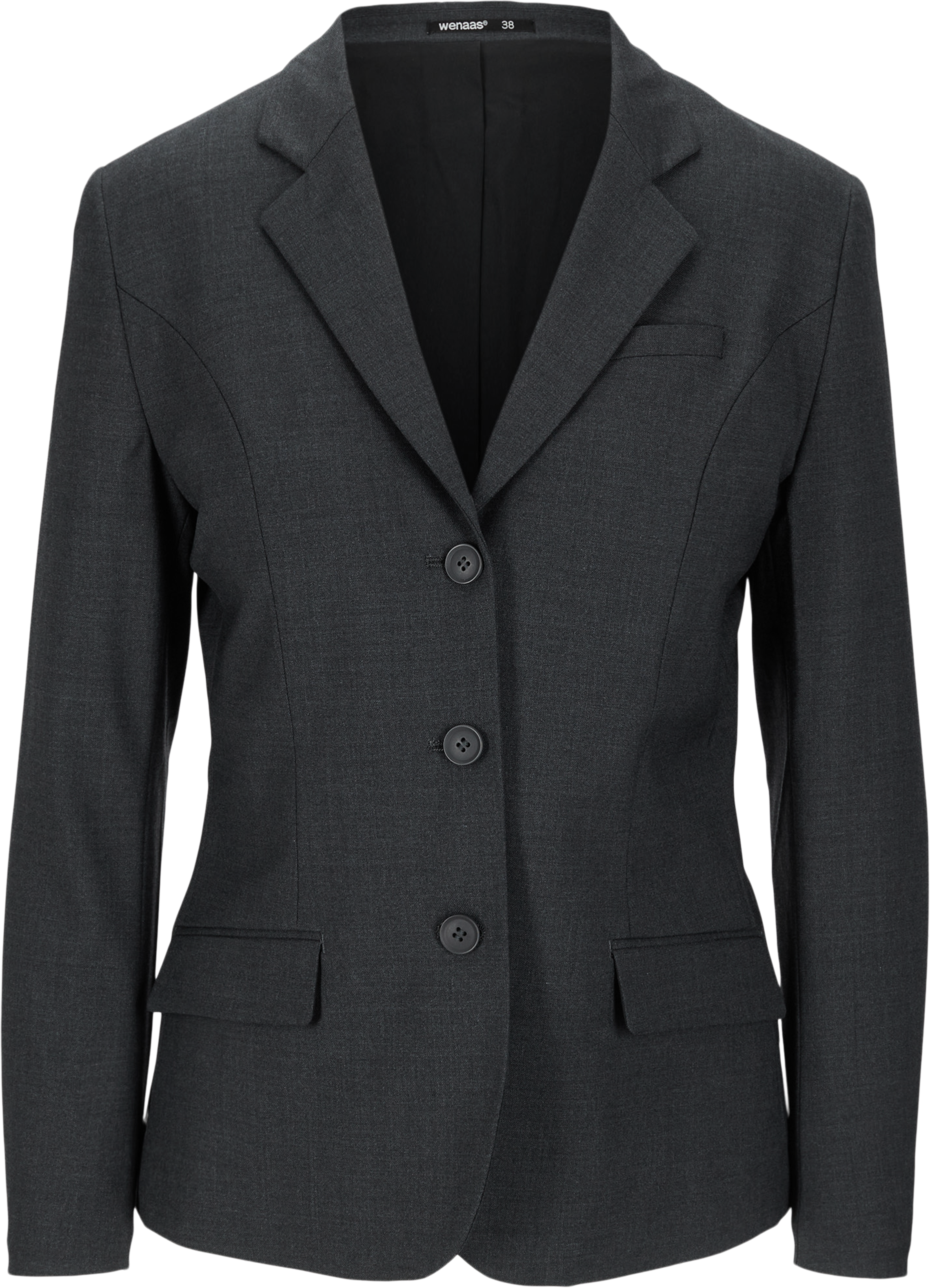 Tailored single-breasted blazer with stretch for women. Jacket with collar and three practical pockets in the front, two besom pockets with flaps and one chest pocket. Sleeves with two seams with closed slits and three decorative buttons on sleeves. Princess seams in the front and back and closes with three buttons in the front Two practical inner pockets and elasticated lining inside for improved mobility.